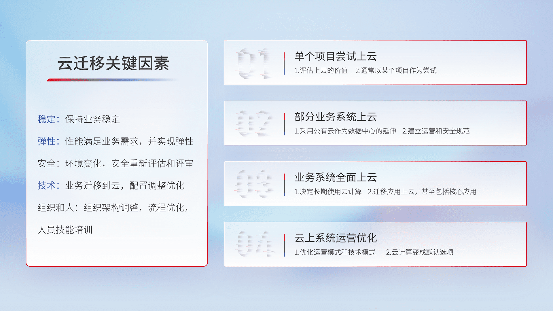 结合实际业务,,,,从规划设计、、云平台选型、、、、云原生改造、、、、数据迁移、、、、集成交付,,,迁移全过程为客户识别最佳上云路径,,,做好风险识别管理,,设计网络架构、、、、身份权限、、安全审计合规、、、操作审计、、日志审计、、、、监控告警策略、、多站点容灾设计等,,,对云上基础设施进行整体规划,,,提升IT治理水平,,,,以满足弹性、、、、高可用、、、高性能的需求。。。