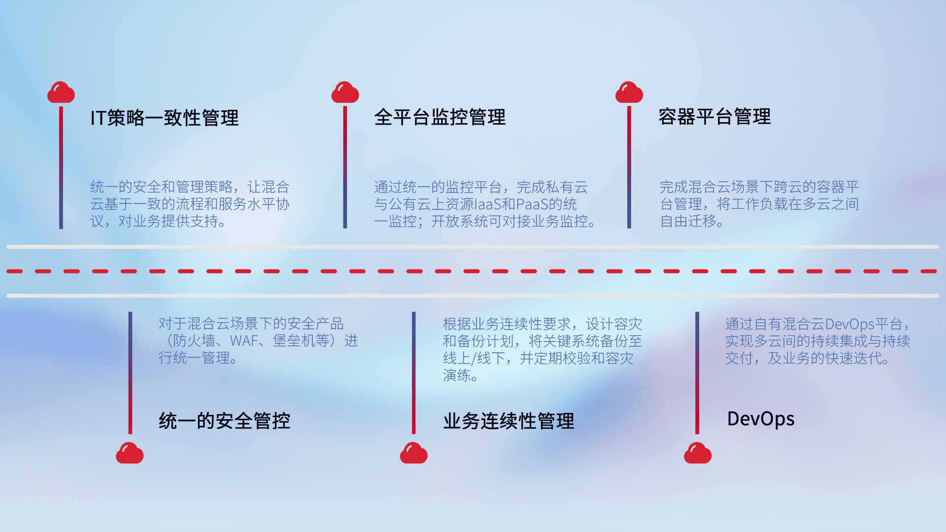 通过多云纳管,,以统一的资源数据模型把客户的云资源进行抽象和封装,,,进而实现对多云资源的统一操作,,保障云资源管理的可靠性、、、、稳定性与可用性。。。。量身定制化运维内容,,配置、、、、开发运维、、、补丁管理、、、、备份、、监控、、、、认证和访问管理、、、审计和日常巡检等,,保障在用云过程中的可靠度,,稳定度以及高可用率。。