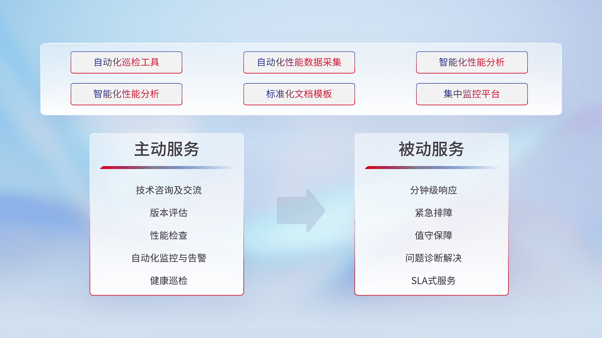 智能化工具和标准化文档,,保障服务质量,,提供主动服务(包含技术咨询、、版本评估、、、性能检查、、自动化监控与告警、、健康巡检)和被动服务包含(分钟级响应、、紧急排障、、、值守保障、、、问题诊断解决、、、SLA服务)。。