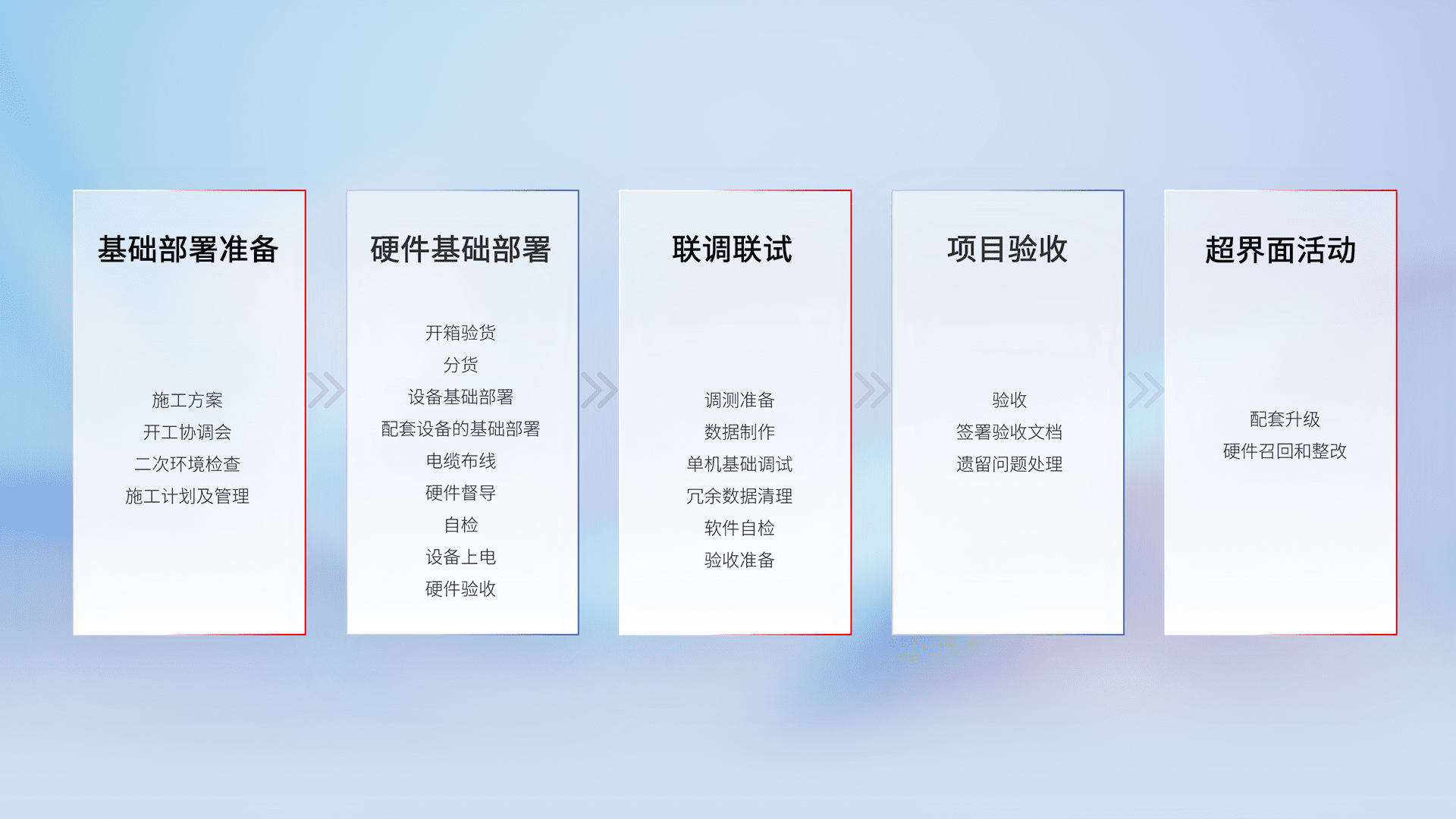从基础部署准备、、、、硬件基础部署、、、联调联试、、项目验收、、、、越界面活动的全过程可追溯,,,保证施工质量和进度。。。